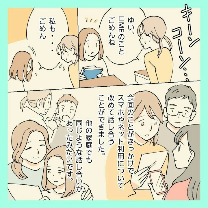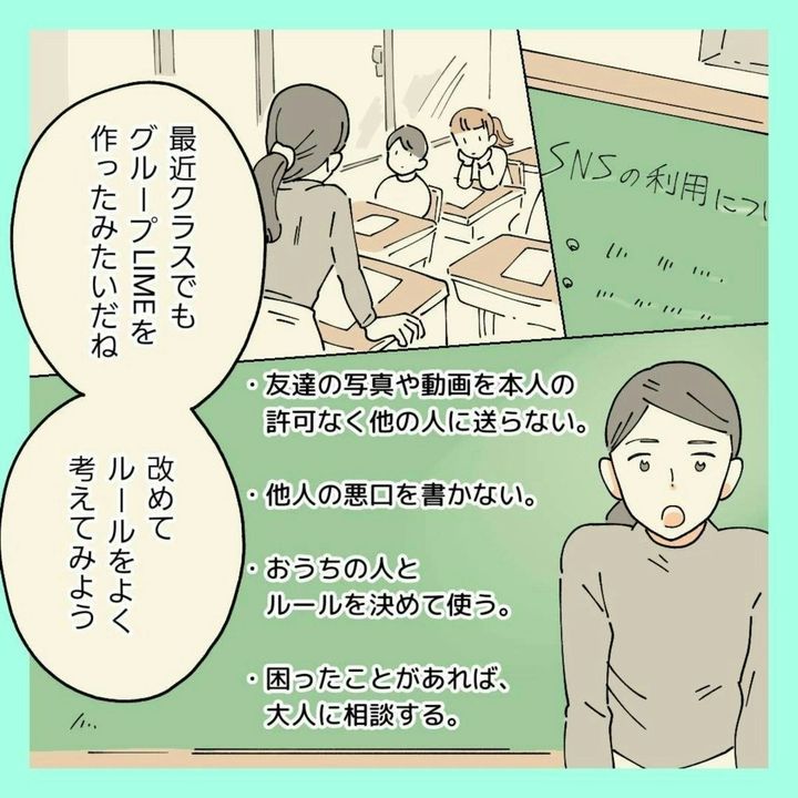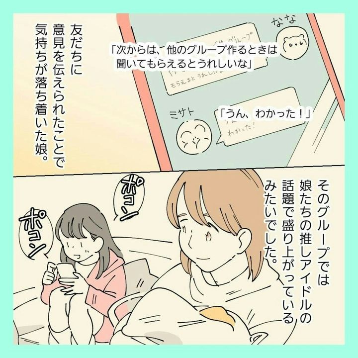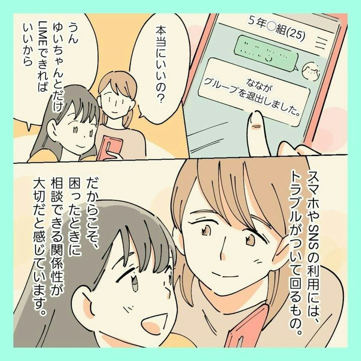 子ども同士のSNS利用はトラブルにつながりやすいイメージもありますよね。不安もある中、娘の気持ちを尊重したいと考えた、ななの両親…。家族間でルールを作り、SNSグループへの参加を認めました。