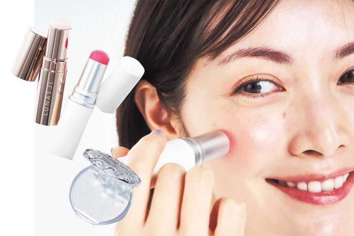 (左から)肌の奥から満ちるうるおいと発色。トゥルーディメンションラディアンスバーム TP005 10g ¥2,860(hince) ツヤで顔に立体感を。ルナソル ラディアントスティックN 02 ¥4,950 (カネボウ化粧品)ハイライター 04 ¥638( 井田ラボラトリーズ)