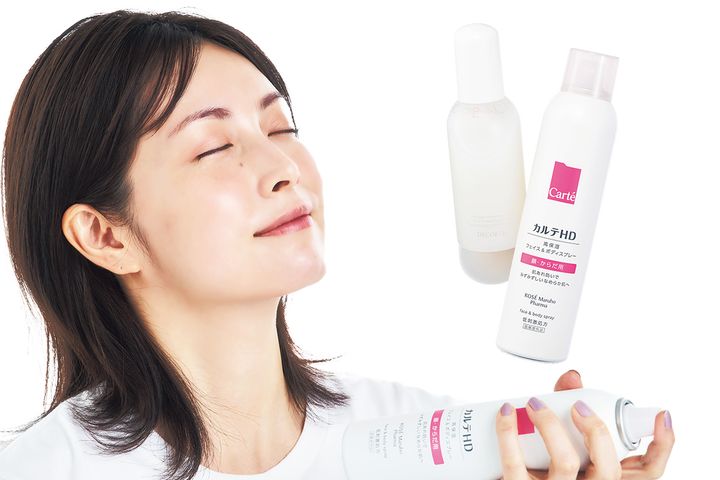 (左から)薬用 マイクロバーム ミスト 150ml ¥3,850[医薬部外品](コスメデコルテ)携帯に便利なサイズ(60g ¥990)もあり。カルテHD モイスチュア フェイス&ボディスプレー 150g ¥1,980〈※価格はともに編集部調べ〉(コーセー マルホ ファーマ)
