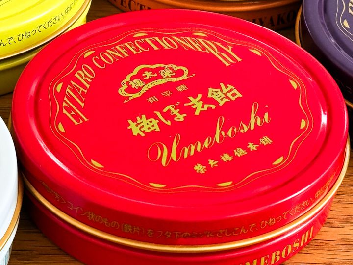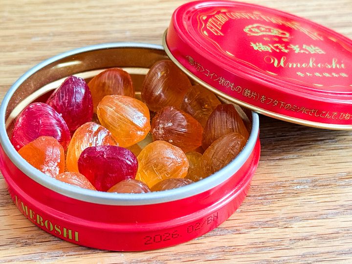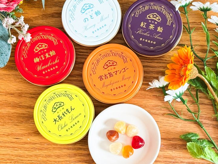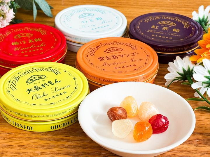 今回紹介するのは、携帯しやすいポケット缶。フレーバーは、元祖である「梅ぼ志飴」をはじめ、「紅茶飴」、「のど飴」、国産果物使用した無香料、無着色の「大長れもん」、「宮古島マンゴー」の5種類です。