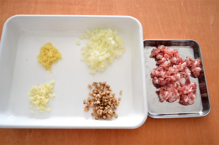 1. 豚肉は1cm角に切る。[A]はそれぞれみじん切りにする。[B]は混ぜ合わせておく。