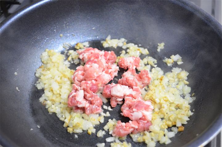 2. フライパンに[A]と塩、サラダ油を入れて中火にかける。玉ねぎに透明感が出て、にんにくとしょうがの香りが出てきたら、1の豚肉を加えて8割ほど火が通るまで炒める。