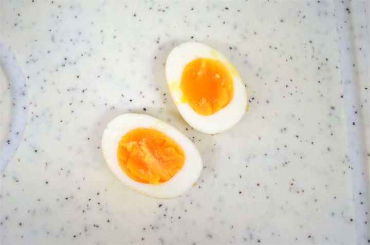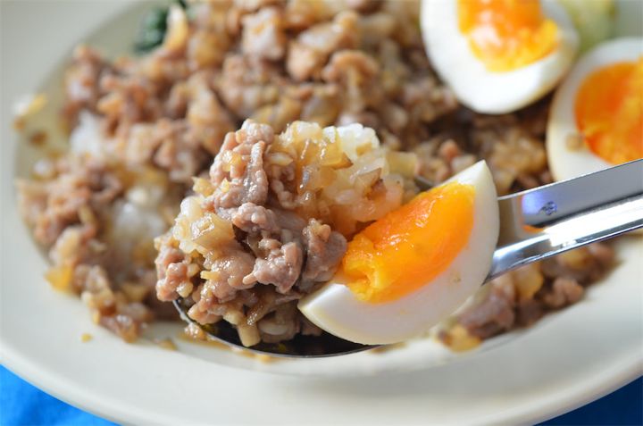 4. 器にご飯を盛り、3の具とチンゲン菜をのせ、半分に切った茹で卵を添えたら完成。