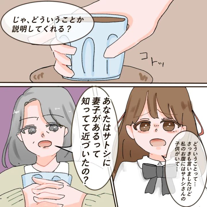 そして、「じゃ、どういうことか説明してくれる?」お茶を出しながらケイコさんがたずねると、「どういうことって・・さっきも言いましたけど、私のお腹にはサトシさんの子どもがいて・・」アイさんがそう言うと、「あなたはサトシに妻子があるって知ってて近づいたの?」とケイコさん。