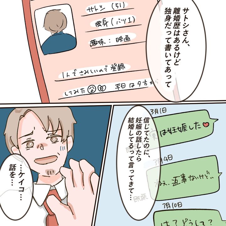 「サトシさん、離婚歴はあるけど独身だって書いてあって。信じてたのに、妊娠の話したら結婚してるって言ってきて・・」アイさんがこれまでの経緯を話すのを聞いて、「・・ケイコ・・話を・・」と動揺するサトシさん。