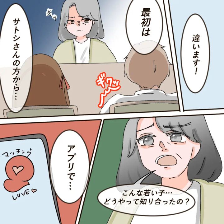 すると、「違います!最初はサトシさんの方から・・」アイさんにそう言われてギクッとするサトシさんを、ケイコさんはギロリと睨みつけた後、「こんな若い子・・どうやって知り合ったの?」サトシさんにたずねると、「アプリで・・」とアイさんが答え、