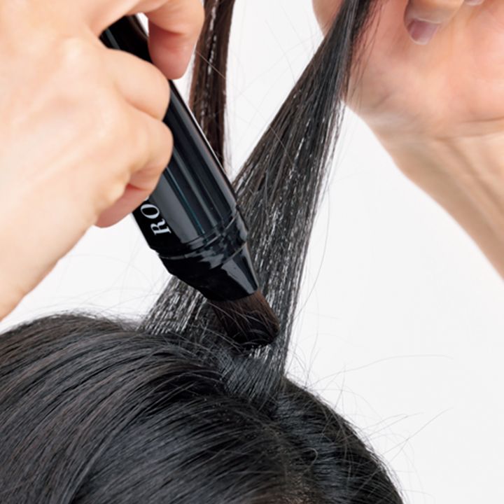 ケアしたつもりなのに、髪をかきあげると白いところが出てくるのは片面しか塗られていないのが原因。両面をしっかり塗るのが大切です。塗布するときはナチュラルに仕上がるように生え際は少量ずつブロッキング。頭皮に押しあてて塗るとボリュームがなくなりムラになるため、毛を頭皮に対して垂直に持ち上げてから根元の両面に塗布。白髪は伸び具合でアイテムを変えるのもポイント