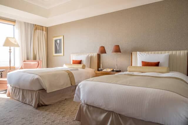 落ち着いた雰囲気の客室は、ゆとりのある42平米。横幅120cm ×長さ205cmのベッドが2台置かれています。