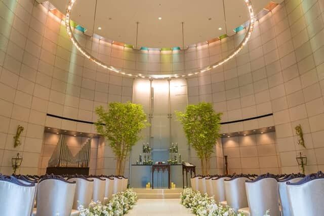 天井高が7mもある壮麗なチャペルは、光、水、木をテーマに、オルガンやハープの音色、聖歌隊の歌声が天から降りそそぐように響きわたります。