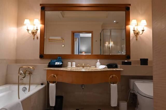 バスルームには洗面とバスタブ、ガラス張りのシャワーブース、トイレを備えます。さらにベイビューフロアのスイートルームとエグゼクティブフロアでは、今治タオルを採用しています。