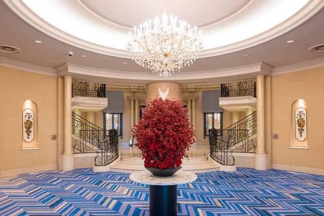 金色に縁取られたロイヤルブルーの絨毯が敷かれ、優美な意匠で制作された手すりも華やか。ウエディングフォトでも必ず舞台になる人気のスポットです。