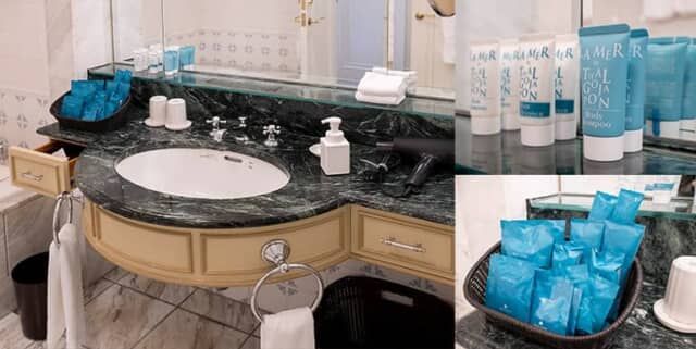 客室備え付けのアメニティーはひと通りそろっていました。シャンプー類は客室タイプによって異なります。エグゼクティブフロアとベイビューフロアのスイートは、オキナワモズクから抽出した海藻エキス配合の「タルゴジャポン」LA MERシリーズで、ミニボトルを用意します。