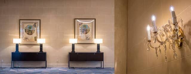 ▲エレガントな照明器具も上質なホテルのあかし