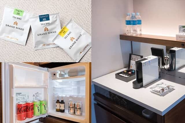 ▲備え付けのドリンクは客室タイプによって異なります