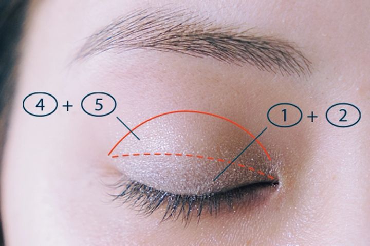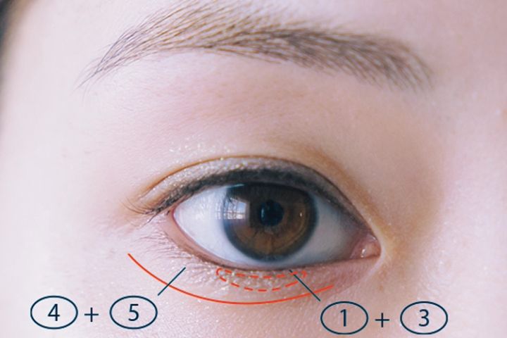 下まぶたにはを混ぜて黒目下のきわにのせる。最後にを大きめブラシで上下のまぶたにふわっとのせる。