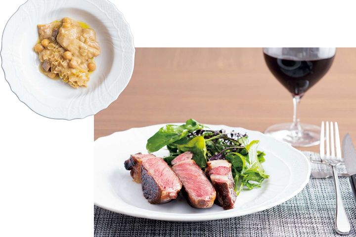 サカエヤ仕入れの十勝若牛リブロースは、驚くほど脂が軽い。スキレットで火入れしては休ませつつ、グリルで焼き上げるメインの一皿。/近江牛のハチノス、赤センマイ、モウチョウの煮込み。上質な素材ゆえに、クリアな味や食感を引き出すシンプルな仕立てに。ともにコース¥13,200より。