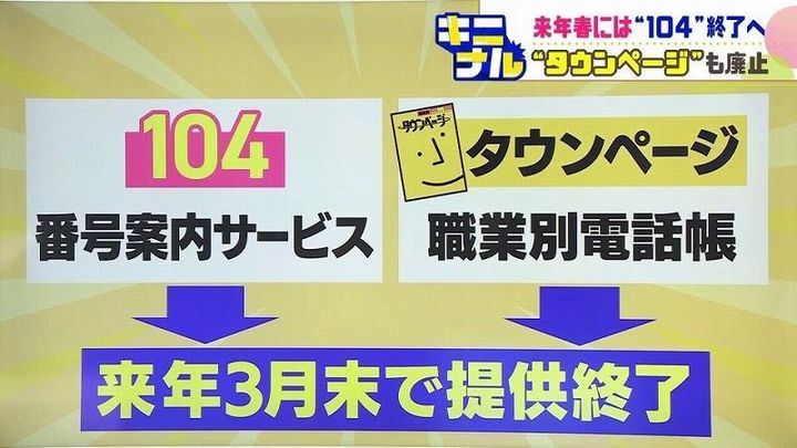 「104」番号案内サービスと職業別電話帳タウンページについては、スマートフォンの普及などで電話番号の検索方法が多様化し、利用数が大幅に減少していることなどから、2026年3月末で提供終了が決まっています。