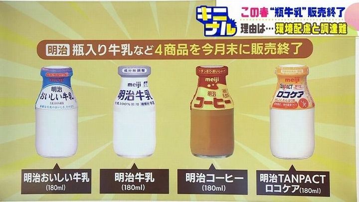 乳製品などを販売する「明治」は180ミリリットルサイズのびん入り4商品を3月末で販売終了すると発表しています。