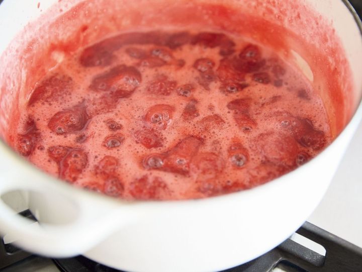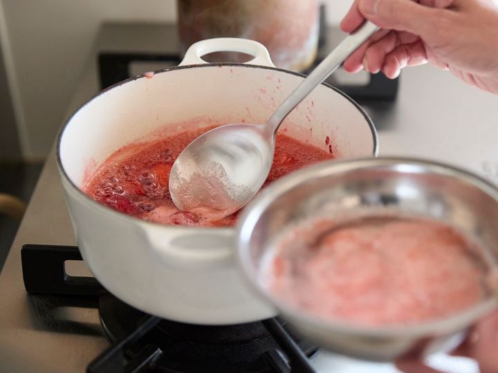 中火にし、いちごがおどらないくらいの状態を保ちながら、ときどき混ぜて10分ほど煮つめる。