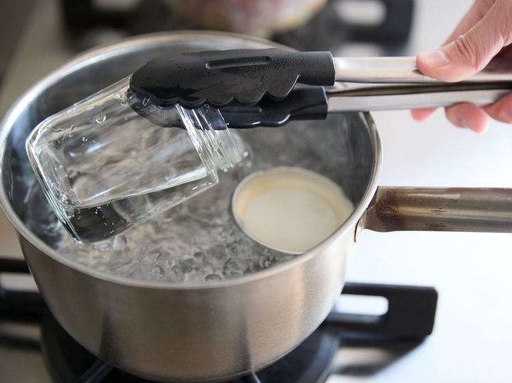 保存びんとふたは、鍋にたっぷりの湯を沸かして5分ほど煮沸し、自然乾燥させておく。