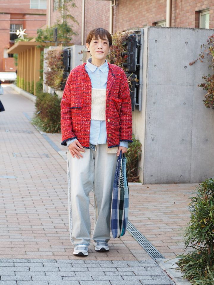 かっちりした雰囲気のツイードジャケットに合わせたのは、デザイナーの岡ゆみかさんが手がける「アンスクリア」のウォッシュデニム。きれいめとカジュアルな要素を絶妙なバランスで楽しむノリコさんならではのスタイルが印象的。