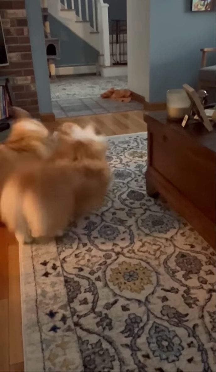 その後も周りをグルグル走り回りながら、体当たりを繰り返す子犬。 どうやら、ママが遊んでくれるまで続けるつもりみたいです。