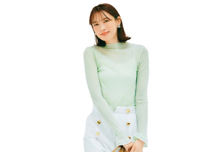 淡いグリーンニットを主役に、抜け感重視のモテカジュアルスタイル。ブラウンのワンハンドルバッグが、コーデを引き締めるいい仕事っぷりを発揮。髪を耳にかけて、顔周りはすっきりと。