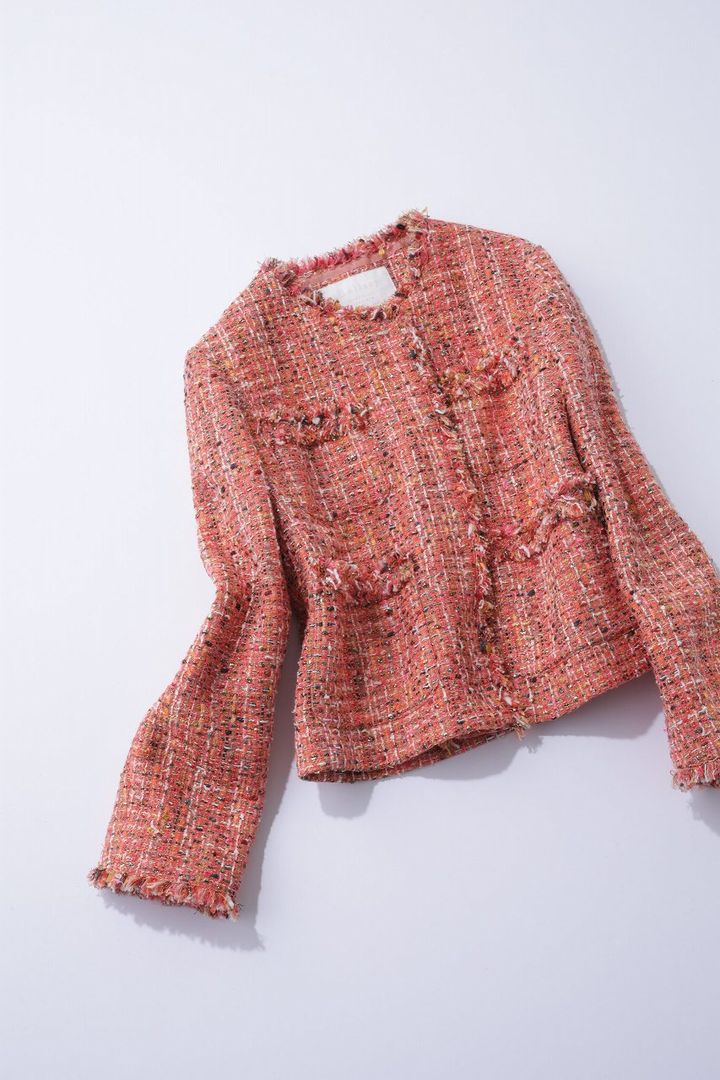 いろんな色のウール糸がしっかり織り込まれている本格派ツイードジャケットは、とにかく暖か。4月の前半は極寒な花冷えの日が急に出てきたりするから、そんな日にひと羽織りするだけで、保温&オシャレが叶う最強の1枚なんです。ツイードってモノトーンを選びがちだけど、コンサバ感が強くてクラシカルに見えてしまうので、ここは思い切ってキレイ色を選ぶのがポイント。ボトムスはベーシックカラーを選んで、ジャケットの存在感を引き立てて。オフィスシーンなら、シンプルなテーパードパンツやミディスカートで上品にまとめるのが◎。休日はデニム×ロゴTでカジュアルに振ると、ぐっとこなれ感がアップ。この春は、ちょっと大胆なカラーのツイードに挑戦して、ドラマチックなムードを楽しんでみて。
