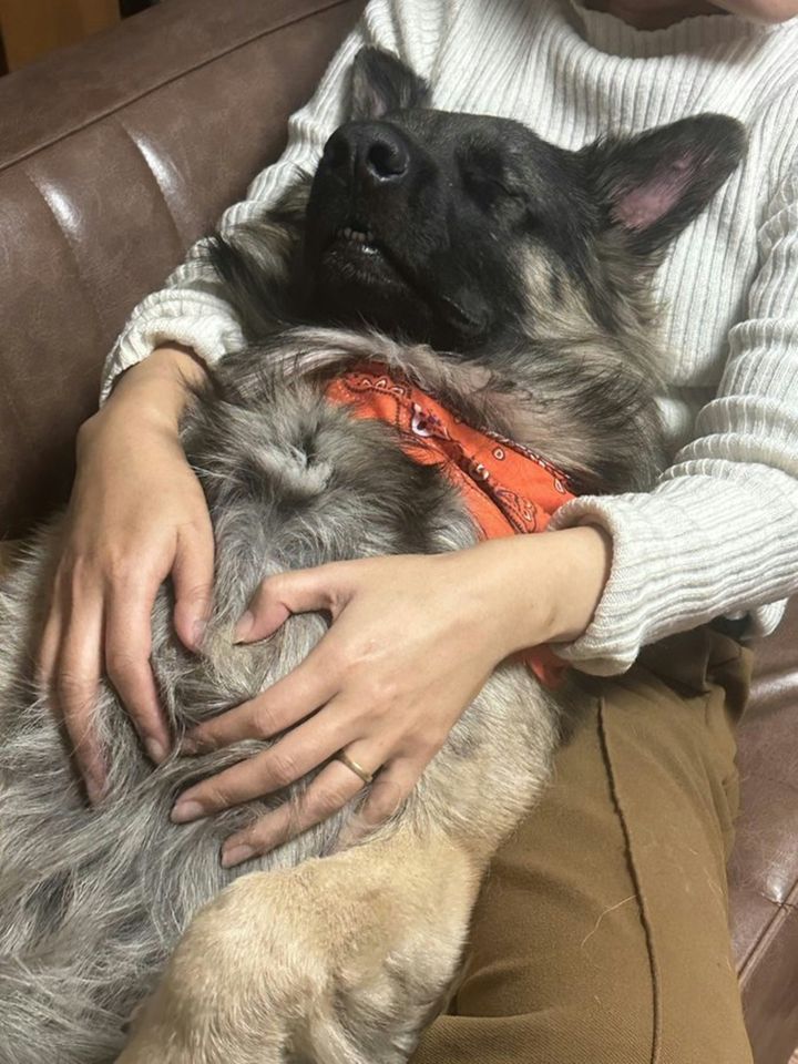 飼い主さんの鼓動と温かさを感じながら、警戒心ゼロで安心している様子が伝わってきますね。心から飼い主さんを信頼しているからこそでしょう。警察犬のイメージが強いシェパードのこんなにやわらかい表情は、なかなか見られませんよね。