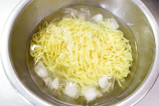 2. 沸騰したお湯(分量外)で、袋の記載時間通りにラーメンを茹でます。茹で上がった麺は氷水(分量外)で締め、水分をしっかり切ったらゴマ油をまぶします。