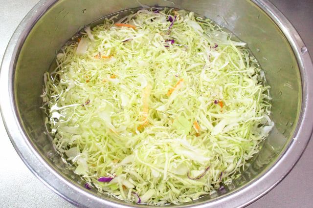 今回は包丁で切りましたが、スライサーを使った方がより薄くなって、水分が出やすそう。塩揉みして、「らーめんサラダ」が出来るまで置いておきました。