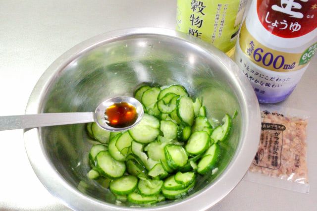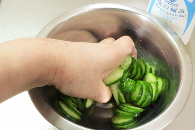 1. きゅうりを出来るだけ薄い輪切りにし、塩を振って軽く揉み、しばらく置いておきます。