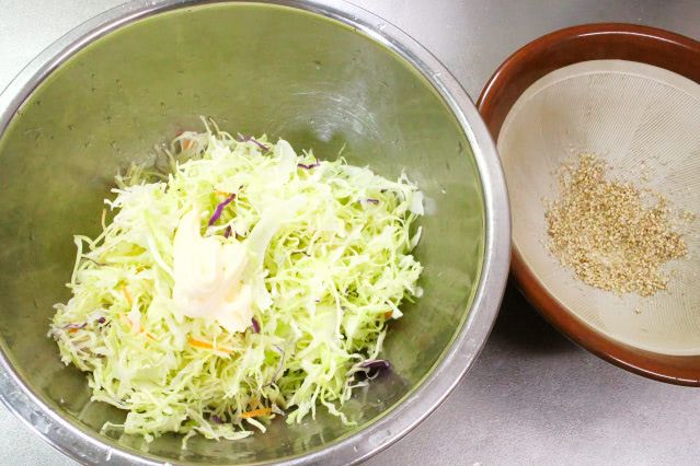 3. カット野菜を少しの間、水(分量外)に浸し、シャキッとさせたら水気を切ります。マヨネーズ、塩、うま味調味料を加えてよく和えます。ゴマをすります。