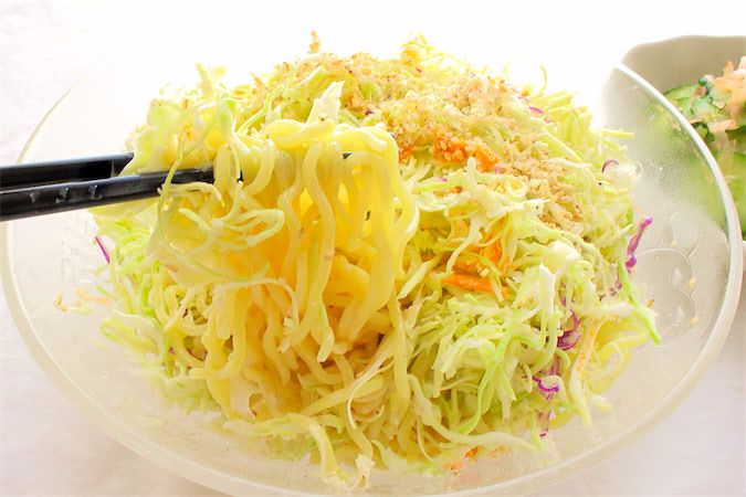 【キャベツ価格高騰】だから…市販の千切り野菜で「らーめんサラダ」作ろう!野菜をたらふく食べられます