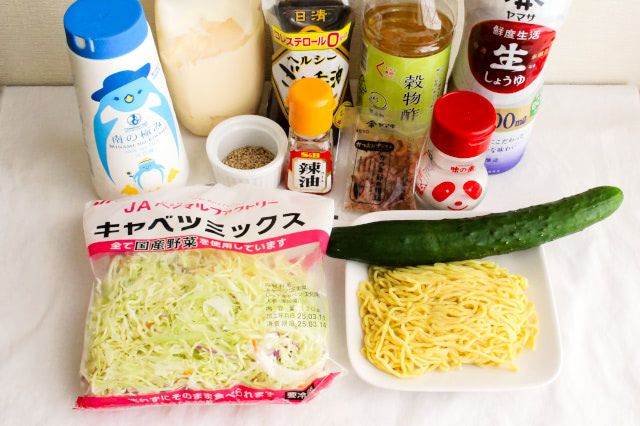 市販の千切りキャベツを使ったので、キャベツが極細かつ繊細な食感。ほんのりとゴマ油の風味が効いたラーメンがつるっとしていて、マヨネーズで和えた野菜と好相性。さっぱりといただけます。