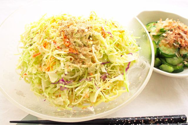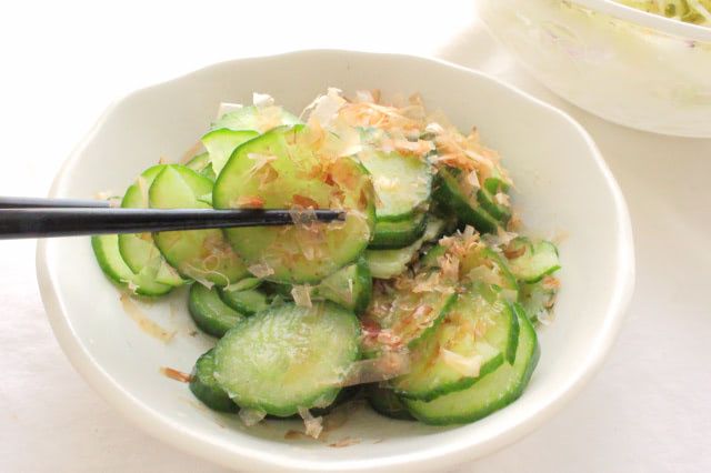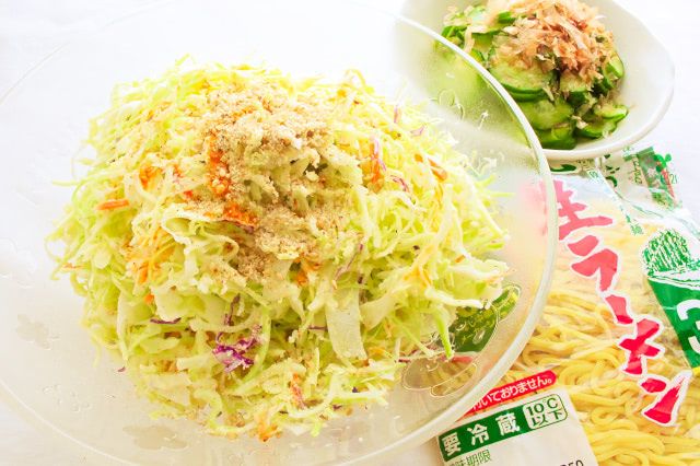 しっかりと水気を絞ったきゅうりに、酢としょうゆを和えます。お皿に盛り付けてかつお節を乗せたら、「きゅうりの副菜」も完成です。「らーめんサラダ」に添えて、いただいてみます。