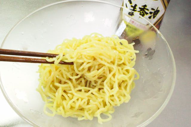 冷やした麺にゴマ油をまぶします。下味が付くうえ、麺同士がくっつかずに、つるっとすすれるそうですよ。