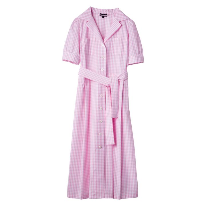 〈アニエスベー〉から、初夏のコレクションのキーカラーでもあるピンクのシャツドレスが到着。ブランドの定番ともいえるギンガムチェックで、一気にフレンチシックなムードに。大きな襟と広く開いた首元は、顔まわりをすっきりと見せてくれる。ボタンを開けてコート代わりにしたり、ベルトを使ってシルエットに変化をつけたりすれば、着こなしの幅がぐっと広がる。