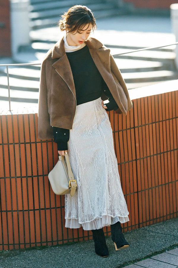 クロップトトップスにスカートをコーデするなら、腰回りがすっきりとした裾広がりなマーメイドがオススメです。ブラウンのボアと白レースのカフェラテトーンに黒を混ぜて引き締めつつ、白タートルで洗練された雰囲気もよくばって。