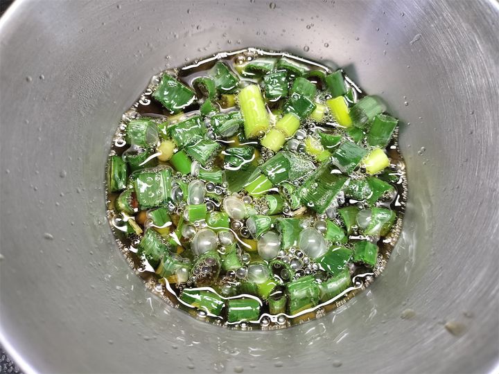 9. フライパンから皿を取り出し青ねぎ油をかけ、醤麻油を添えて出来上がりです。