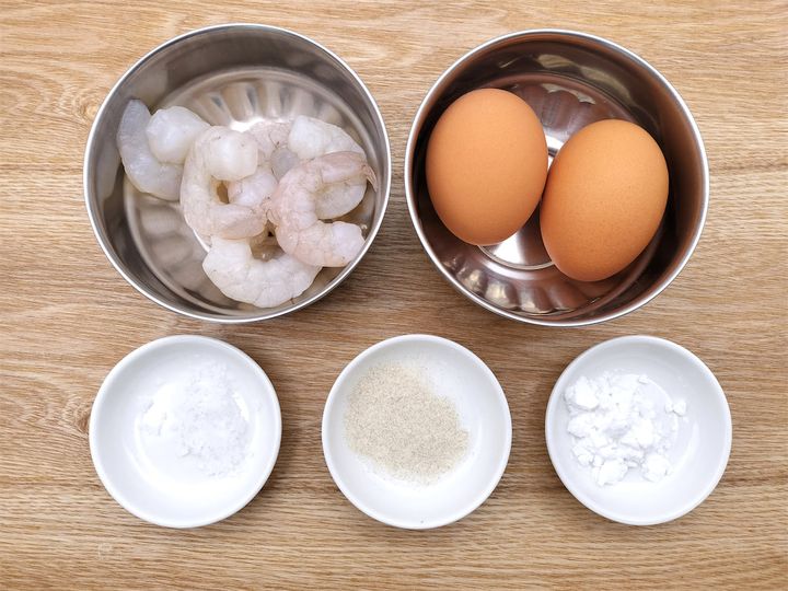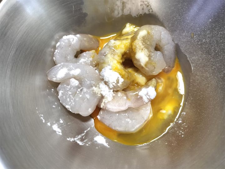 1. ボウルにエビ、塩、こしょう、片栗粉、溶いた卵少々を入れて混ぜます。