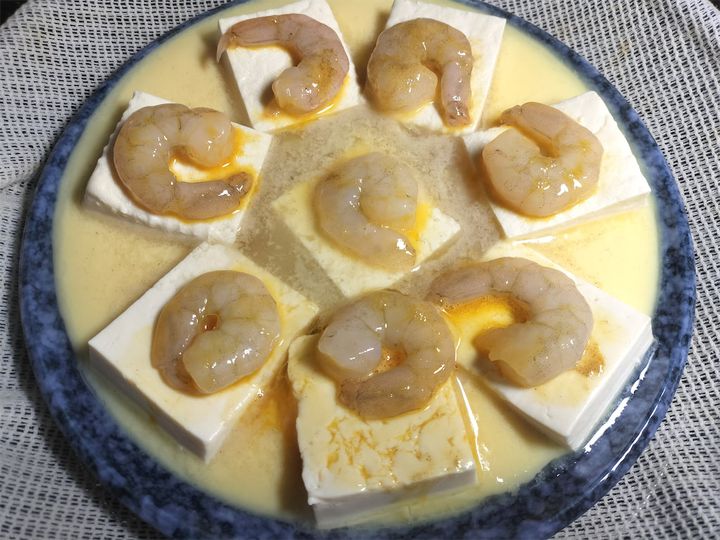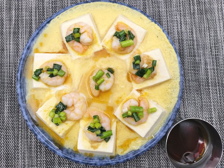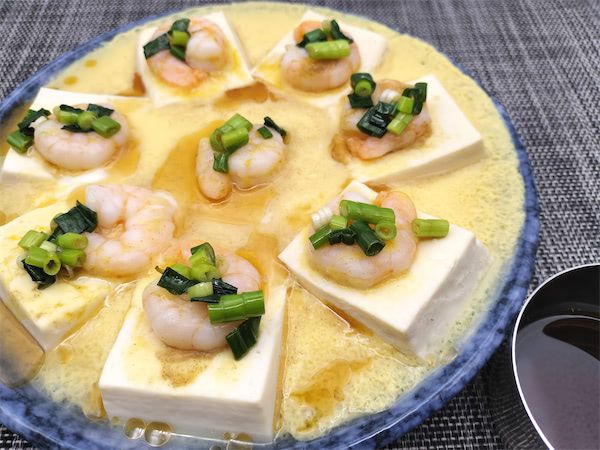 取り皿にひとつ分を取り分けて食べてみると、豆腐がやわらかいのはもちろんのこと、卵液の部分もふんわりとしていてプリプリ食感のエビともとても合っていました。