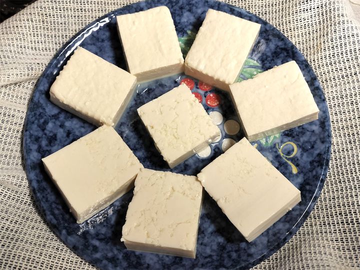 家にある深めのフライパンは30cmですので、中に入れる皿は30cmより小さいサイズでないといけません。でもあまり小さい皿だと豆腐が全部乗らないし、皿表面の傾斜が強いと中身が真ん中に寄ってしまいます。なんとかこの条件を満たす皿がありましたので、見た目もそれなりにできた気がします。