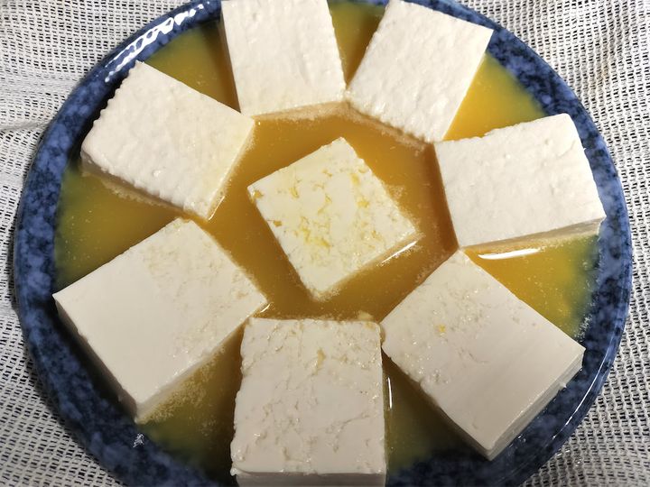 4. フライパンに水を入れて網を乗せ、その上に布巾を敷き、さらに豆腐を乗せた皿を置きます。