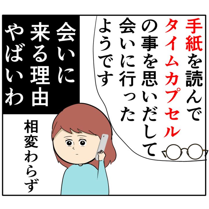 「手紙を読んでタイムカプセルの事を思い出して会いに行ったようです」とジュリ実さんがろみ緒さんに会いに行った理由をめいさんに伝えためが根さん。それを聞いためいさんは「会いに来る理由やばいわ」とドン引き。