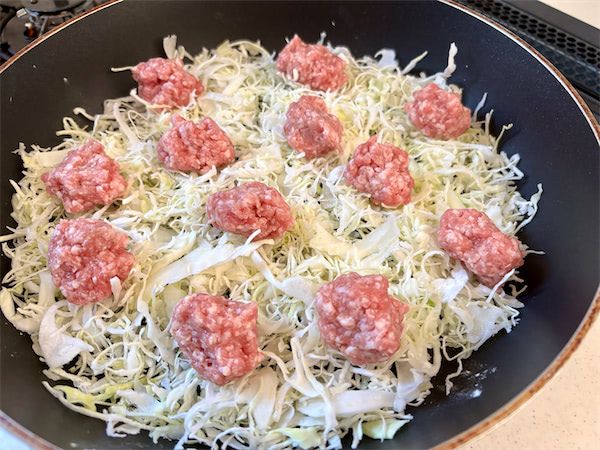 5. 取り出しておいたキャベツを上にのせて広げます。その際、丸めた豚ひき肉ひとつにつきキャベツごとつかんでなんとなく1つずつ寄せておくと後で分けやすくなります。