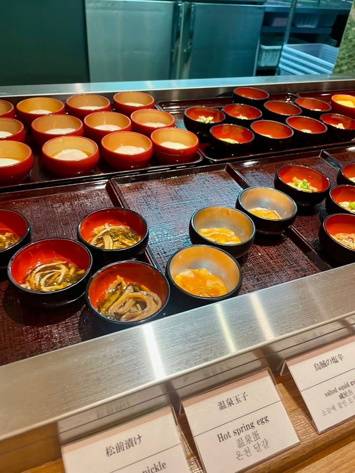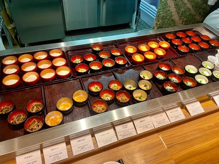 北海道名物の『松前漬け』や朝食といえばの『温泉玉子』など、ご飯のお供や前菜がずらりと並んでいて、好きなおかずを選ぶのが楽しみのひとつですよね~