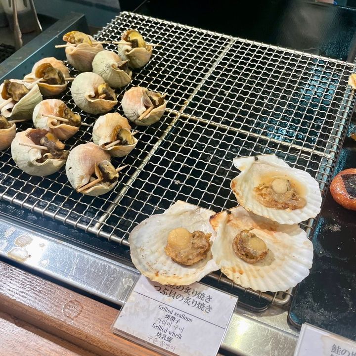 焼き物は『帆立の炙り焼き』や『つぶ貝の炙り焼き』のほかに『鮭・鯖・ししゃもの塩焼き』など、海の幸が勢ぞろい!
