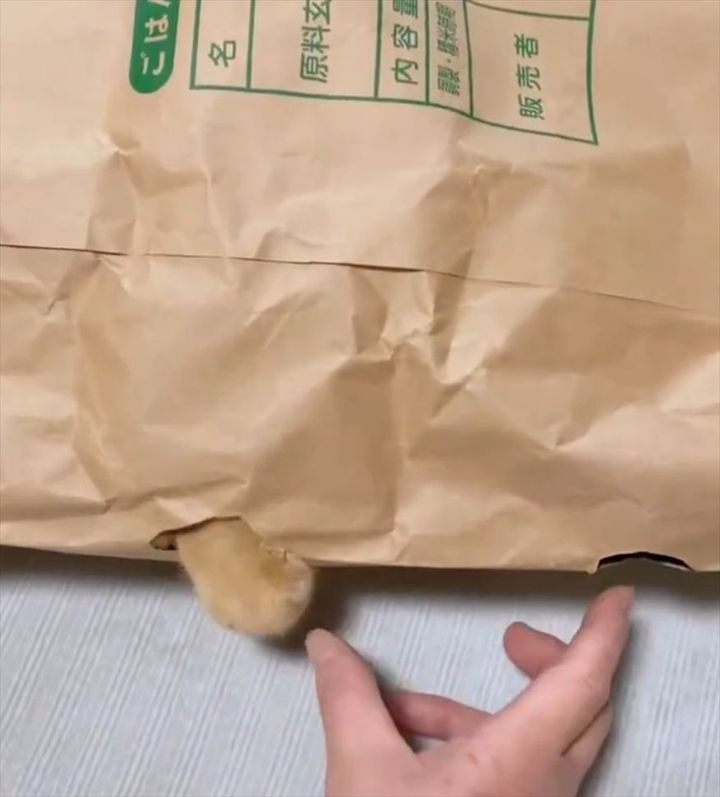 米袋に入ったネコ。 このネコと遊ぶ様子が話題になっています!