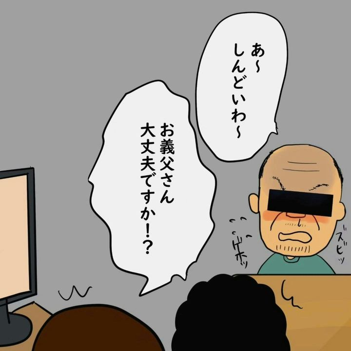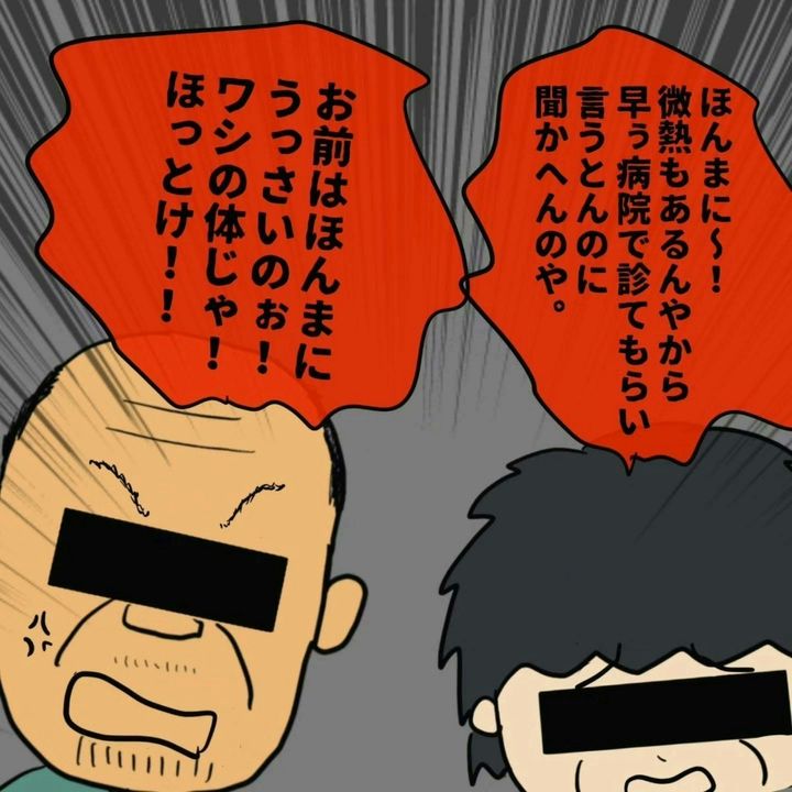 一週間前から、咳と微熱が続いているという義父…。一週間前というと、ちょうど義母がずんさんに電話をかけてきて、遊びに来るようにと誘った時期でした。風邪をひいているのにマスクをしない義父。義父の症状を知っていたのに、家に誘った義母に対し、ずんさんは不信感がつのります…。